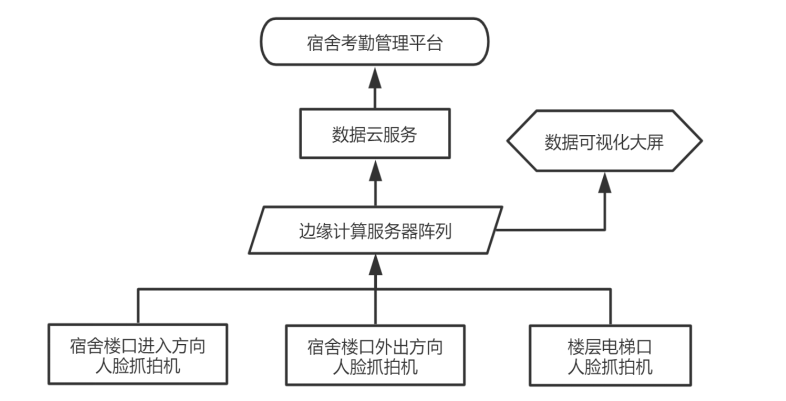基于本校宿舍基本情況,結(jié)合學(xué)校運(yùn)營(yíng)管理模式,將宿舍考勤系統(tǒng)軟硬件模塊按照如下架構(gòu)圖部署。綜合樓大門處出入兩方向根據(jù)樓道寬度分別安裝2-4個(gè)人臉識(shí)別抓拍機(jī),6-11樓層電梯口各安裝2-3個(gè)人臉識(shí)別抓拍機(jī),抓拍機(jī)視頻圖像數(shù)據(jù)通過網(wǎng)絡(luò)路由設(shè)備實(shí)時(shí)匯總*宿管邊緣計(jì)算服務(wù)器陣列,服務(wù)器將視頻流信息中解析出的人臉數(shù)據(jù)與校方學(xué)生人臉庫(kù)信息進(jìn)行實(shí)時(shí)N比N快速驗(yàn)證,獲得學(xué)生身份信息,將對(duì)比結(jié)果實(shí)時(shí)顯示在數(shù)據(jù)可視化大屏上。結(jié)合學(xué)??记诩八奚峁芾?/span>邏輯,將各維度報(bào)表分析推送*云服務(wù)器,校方管理人員可通過宿舍考勤管理平臺(tái)獲取數(shù)據(jù)分析結(jié)果。